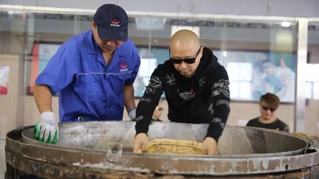 看到釀酒師傅專注的進行著每一個釀酒步驟,他們感嘆,原來釀酒的過程跟自己創作的過程是那么相似:取世間萬千之精華,鑄流芳百世之經典。來自搖滾國度的幾位搖滾硬漢,一邊聽著關于釀酒的知識,一邊模仿著釀酒技師的動作。無時無刻不展示著認真的態度和20多年來的默契。