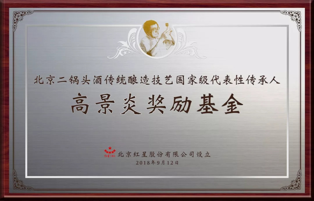 2018年8月18日,北京紅星股份有限公司決定設立《高景炎獎勵基金》,以獎勵在傳承創新國家級非遺——北京二鍋頭酒傳統釀造技藝中做出突出貢獻的紅星員工。2018年9月11日,在前門源升號博物館,紅星股份有限公司總經理肖衛吾宣讀了《高景炎獎勵基金》的決定。